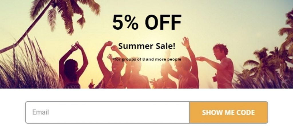 The code gives you 5% off every booking you make for a group of 8 or bigger.